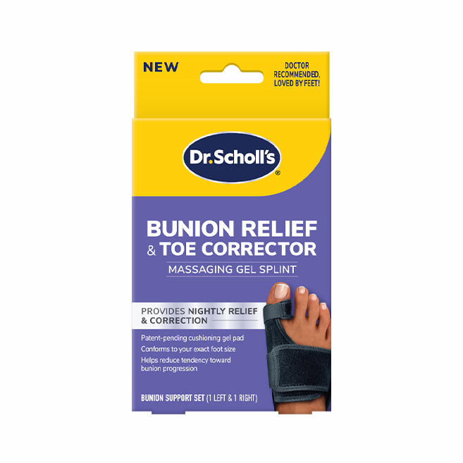 Dr. Scholl's® new Bunion Relief & Toe Corrector Massaging Gel Splint is clinically shown to relieve bunion pain and help prevent it from recurring by correcting toe positioning. The unique patent-pending design can be adjusted to fit your exact foot size – so it’s comfortable to wear at night.