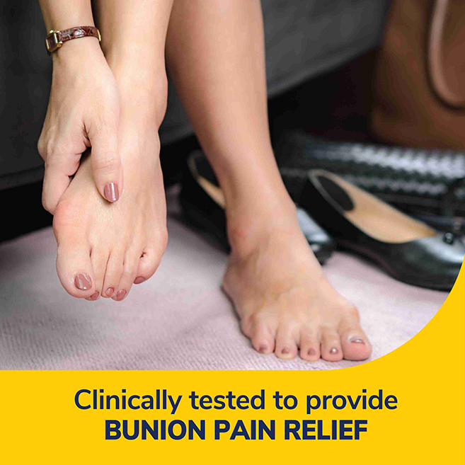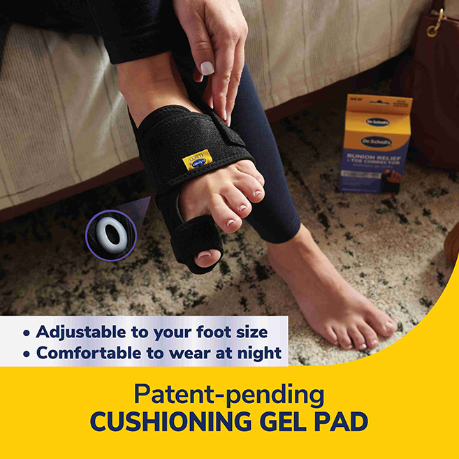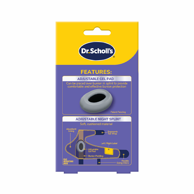 Dr. Scholl’s® Bunion Relief & Toe Corrector contains a gel pad that surrounds the bunion to relieve pressure while the splint gently tugs the toes for correction