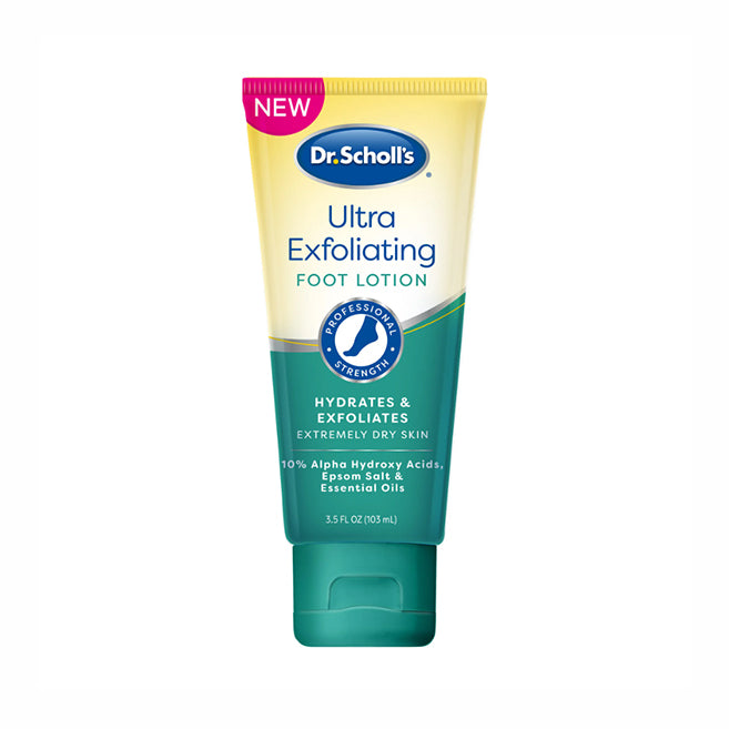 - Dr. Scholl’s® Ultra Exfoliating Foot Lotion is a gentle and effective professional strength formula that safety exfoliates and hydrates the thick and callused skin on your feet. The alpha hydroxy acids safely begin exfoliating while the Epsom salt and essential oils soothe irritated dry skin.