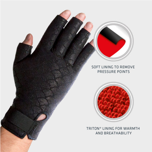 Thermoskin Thermal Compression Gloves are anatomically shaped to provide warmth and even compression for the temporary relief of arthritic pain. A textured inner layer provides additional grip for everyday activities and finger tips cut out, allow a better sense of touch. Sold in a pair.- Front Grip where it is needed