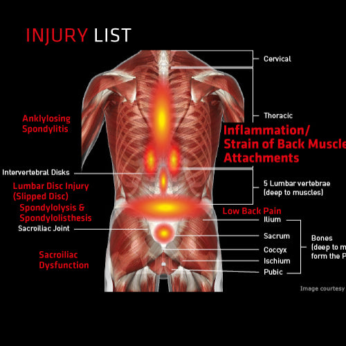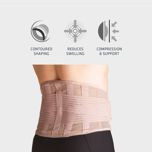 Position the lower part of the back piece on the coccyx bone and then wrap the piece and secure with the fastener. Make sure the middle two internal stays are on either side of the spine. Secure the elastic side straps for extra compression.
